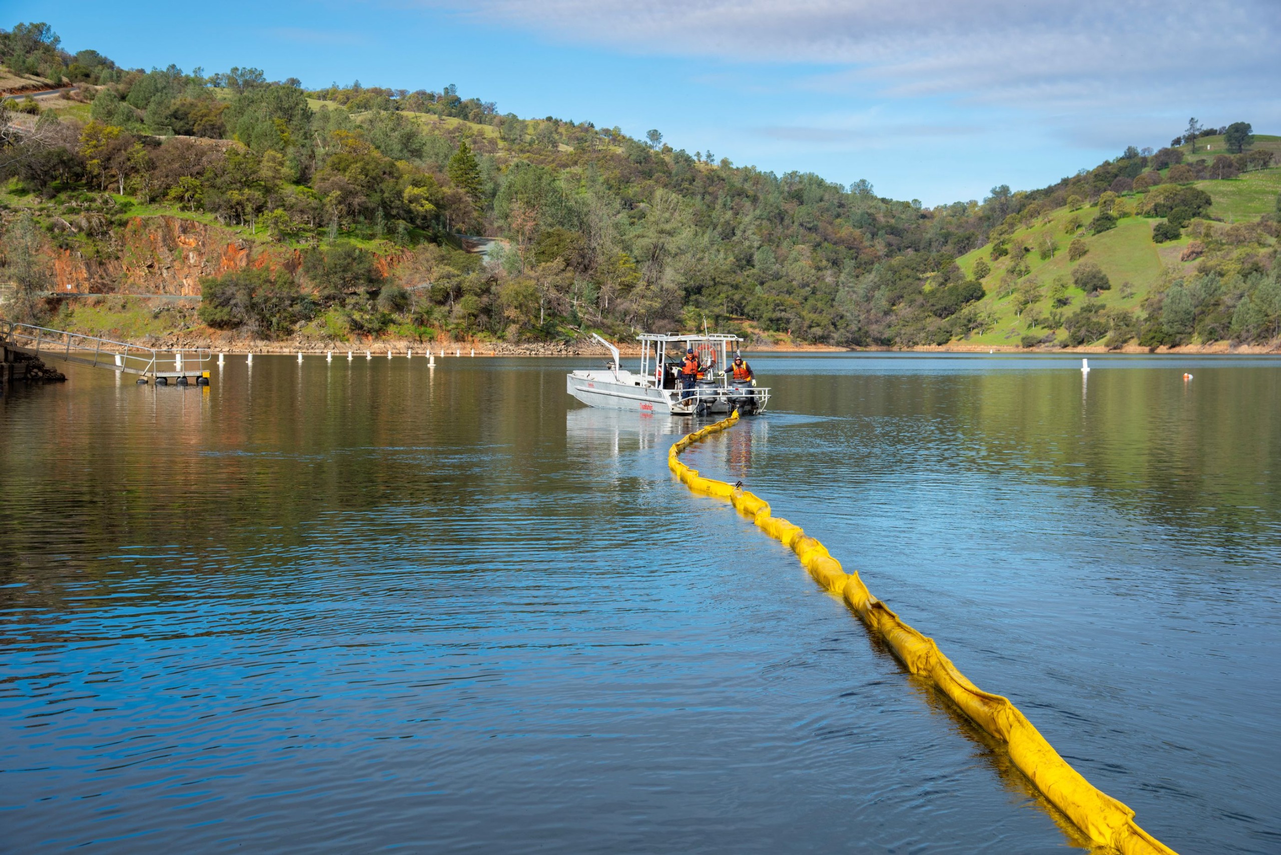 Yuba Water crews and environmental contractors have been on site at the U.S. Army Corps of Engineers’ Englebright Lake since Saturday morning, February 14, focused on containment and debris removal, as well as environmental assessment and monitoring. Crews successfully installed oil booms and debris booms and are installing additional booms this week. The team has made progress on removing large debris and is working around the clock to remove as much debris as possible – as quickly as possible.
