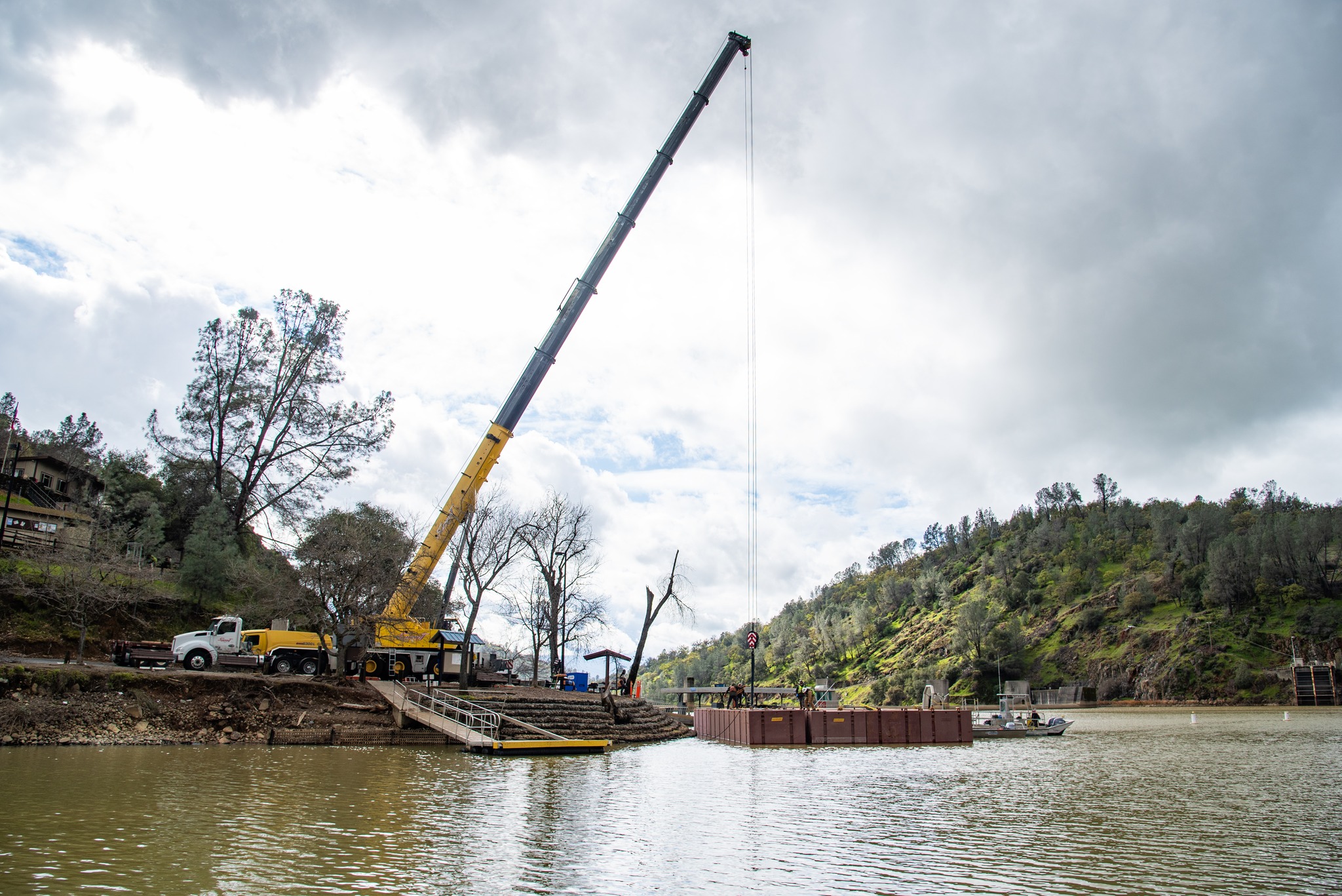 Yuba Water is focused on site safety, environmental protection and damage assessment. Crews are removing debris from the river, installing containment measures such as debris and oil booms, conducting water quality monitoring and testing, and working with environmental and regulatory agencies. Geotechnical experts are assessing hillside stability and identifying long-term stabilization measures.